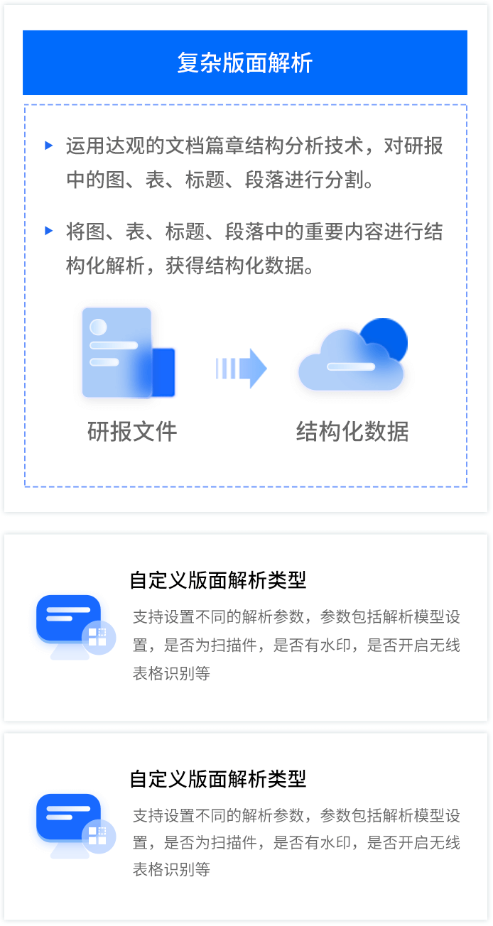 复杂版式研报解析 基于自研的复杂版面分析技术,对双栏复杂的研报进行解析,区分标题、段落、图片、表格等信息,为研报数据、文本、观点抽取和审核建立基础。