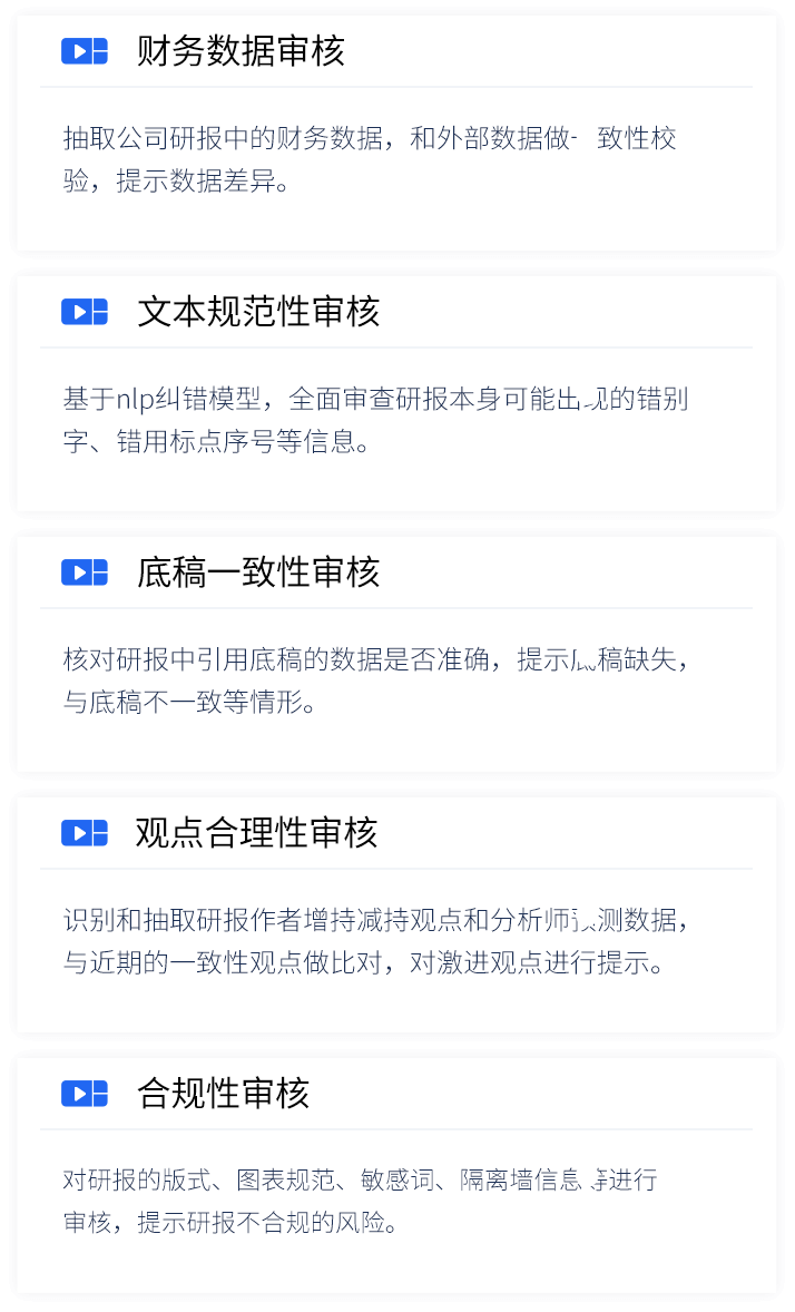 多维度研报智能审核,全面提示风险 基于NLP技术对研报和底稿中的细粒度信息进行抽取,并对研报的文本、数据、观点进行全方位智能审核,降低研报发布的风险,提高研报审核的工作效率。
